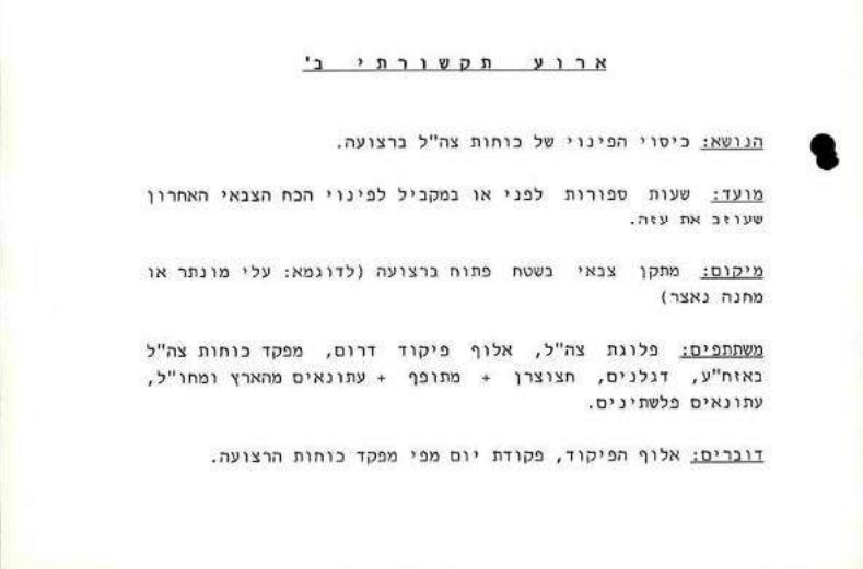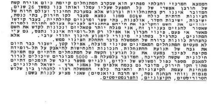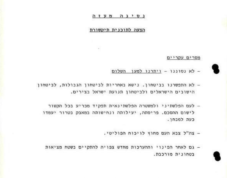 יועץ ראש הממשלה רבין למלחמה בטרור מציע כאן דבר חמור: להקריב את חייהם של לוחמי צה"ל על מזבח יחסי הציבור של תהליך השלום. לא כדי למנוע פיגועים, לא כדי להילחם בטרור או להגן על חיי האזרחים, אלא להסתיר את אופיו האמיתי של תהליך השלום, ולהשתיק את המחאה.